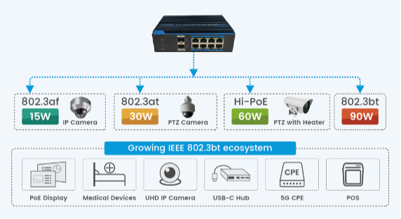 隨著PoE技術(shù)的物聯(lián)網(wǎng)設(shè)備的廣泛應(yīng)用,PoE終端設(shè)備的耗電設(shè)備越來越多。為了滿足這一需求趨勢,優(yōu)特普還展示了90W IEEE 802.3bt PoE++交換機,它可以為智能建筑系統(tǒng)、平安城市領(lǐng)域的瘦客戶端等大功率設(shè)備提供供電和聯(lián)網(wǎng)方案。
