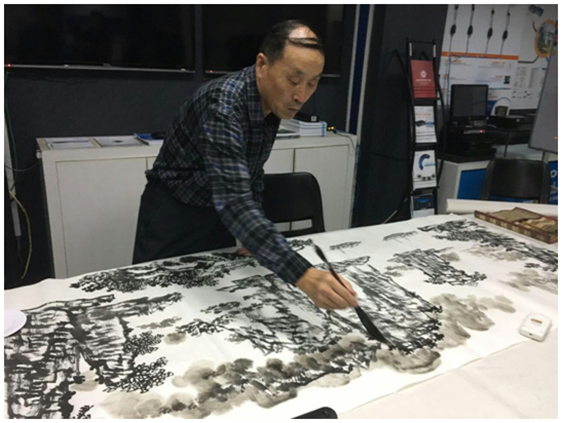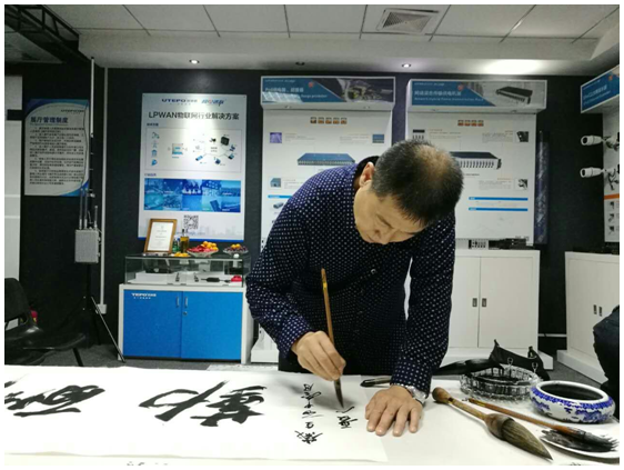 在優(yōu)特普董事長聶懷東的陪同下,中組部黨建辦領(lǐng)導(dǎo)及老師們參觀了優(yōu)特普公司及展廳??匆妰?yōu)特普公司墻上掛著的書法和國畫作品,兩位老師一時興起,在展廳當場揮毫潑墨,作起書畫來。老師們高深的藝術(shù)造詣和精美的書畫作品,讓優(yōu)特普人大開眼界。能如此近距離欣賞大師們的風(fēng)采,實在是機會難得!