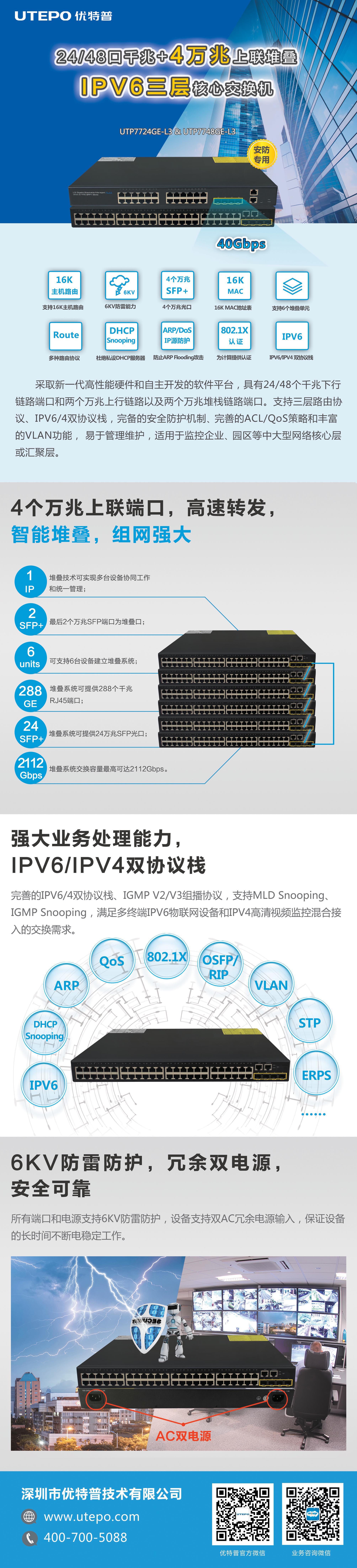 除此之外,核心交換機(jī)還需要考慮系統(tǒng)的可擴(kuò)展性、插槽數(shù)量、模塊類型、模塊冗余、路由冗余等,才能保證1000路監(jiān)控的數(shù)據(jù)高速交換。優(yōu)特普UTP7748GE-L3萬兆上聯(lián)IPV6堆疊核心交換機(jī)具備的以下特點(diǎn)比較符合系統(tǒng)的要求。