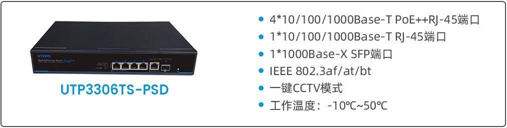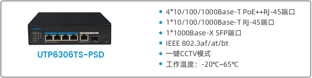 為滿足大功率設備對PoE供電的需求,優(yōu)特普最新推出了4口bt PoE全千兆工業(yè)級交換機UTP6306TS-PSD。該交換機提供4個千兆bt PoE端口、1個千兆以太網(wǎng)RJ-45 和1個千兆以大網(wǎng) SFP 上聯(lián)端口。支持IEEE 802.3af/at/bt標準,每個PoE端口可為PD設備提供90W的最大功率,擺脫了智能網(wǎng)絡設備可用功率限制,可廣泛應用于智慧交通、智慧照明、安防監(jiān)控、企業(yè)園區(qū)等領域。