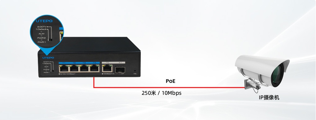 用戶可通過面板上的撥碼開關切換交換機的工作模式,在CCTV模式下,優(yōu)特普交換機的下聯(lián)端口最遠傳輸距離延長至250米 (速率降為 10M)。