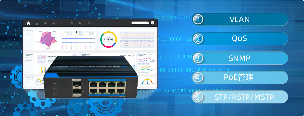 提供豐富的二層管理功能,支持802.1Q VLAN、802.1p QoS、SNMP、STP/RSTP/MSTP、快速環(huán)網(wǎng)等。