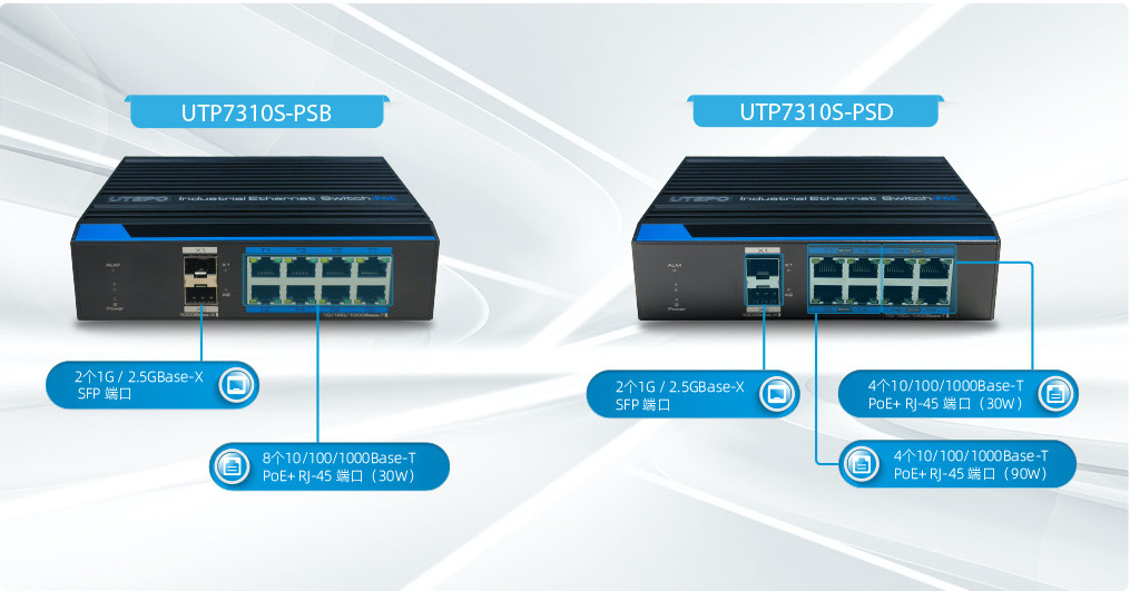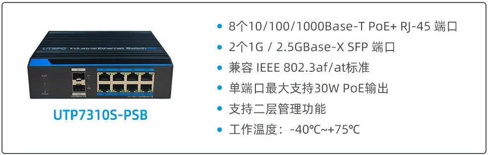 UTP7310S-PSB: 8個(gè)10/100/1000Base-T PoE+ RJ-45 端口 + 2個(gè)1G / 2.5GBase-X SFP 端口