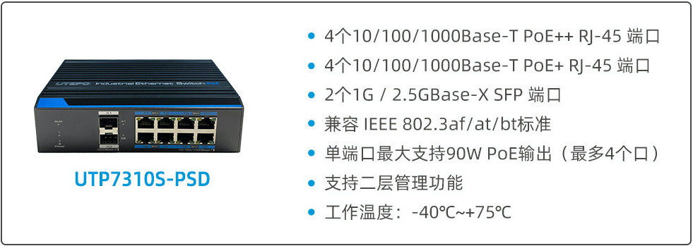 兼容IEEE 802.3bt標(biāo)準(zhǔn), UTP7310S-PSD提供4個(gè)10/100/1000Base-T PoE++ RJ-45 端口,單端口可提供最大90W的功率,滿足了大功率設(shè)備的接入需求。