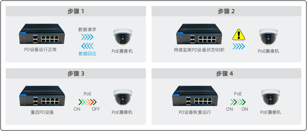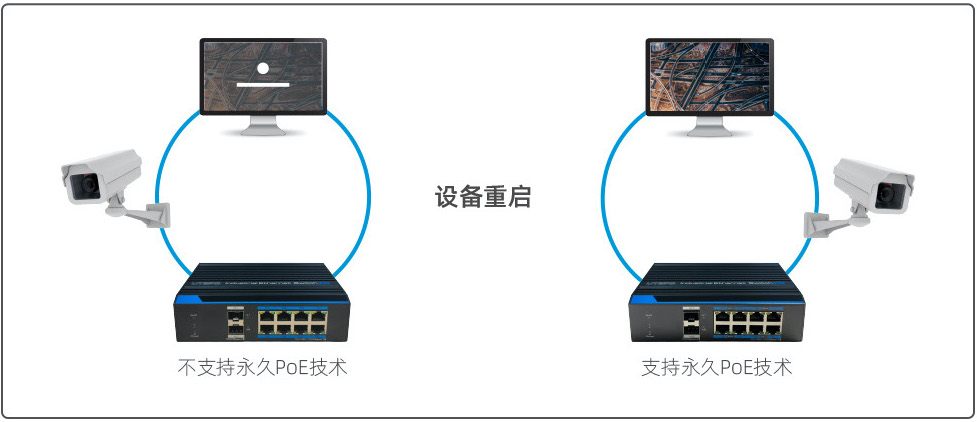 當(dāng)PoE交換機(jī)重啟時(shí),永久PoE技術(shù)能為所連接的PD設(shè)備(PoE攝像機(jī)等)提供不間斷的電源。