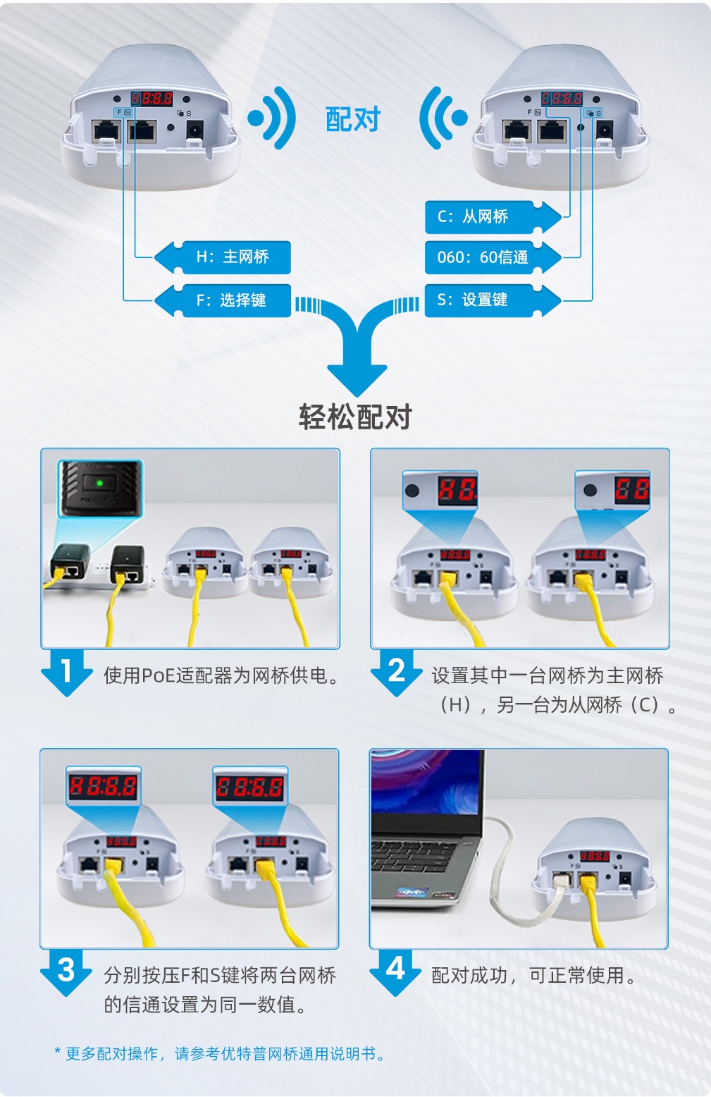 無(wú)線網(wǎng)橋采用獨(dú)特的數(shù)顯配對(duì)技術(shù),無(wú)需電腦配置,輕松完成點(diǎn)對(duì)點(diǎn)、點(diǎn)對(duì)多點(diǎn)的配對(duì)。