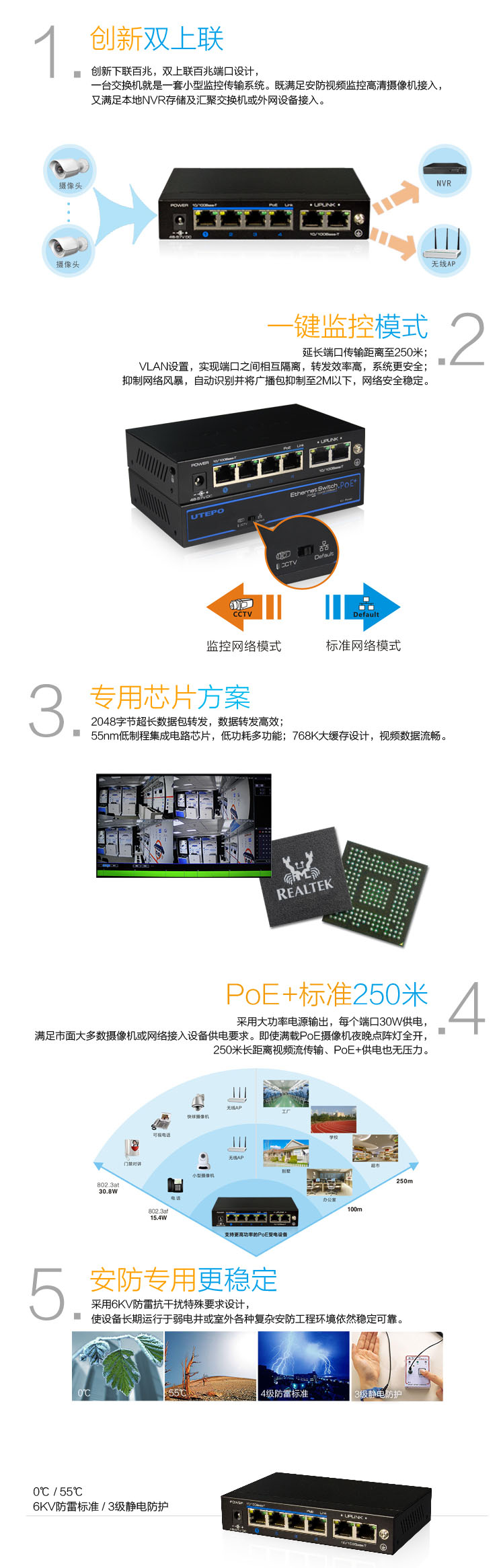 該系列交換機所有下聯(lián)以太網RJ-45端口均支持以太網供電(PoE +),每個端口可提供高達30W的功率,符合IEEE 802.3af/at標準。 該系列交換機支持一鍵CCTV功能,可廣泛用于視頻安全監(jiān)控系統(tǒng)及網絡項目中。